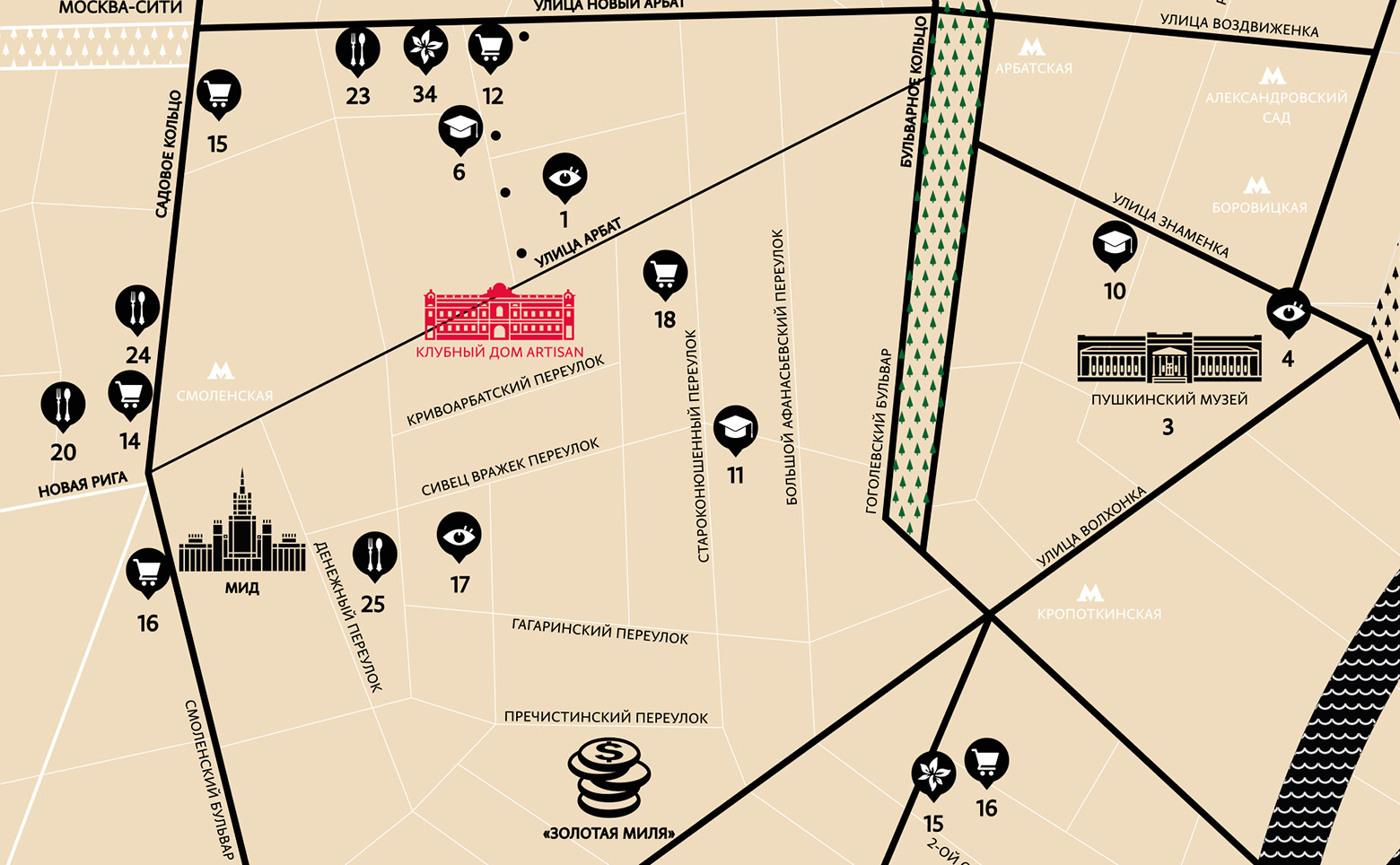 ЖК «Artisan» находится на Арбате. Инфраструктура района развита, в пешей доступности: магазины, кафе, рестораны, детские сады, школы, медицинские учреждения, банки. До метро «Смоленская» — 5 минут пешком.