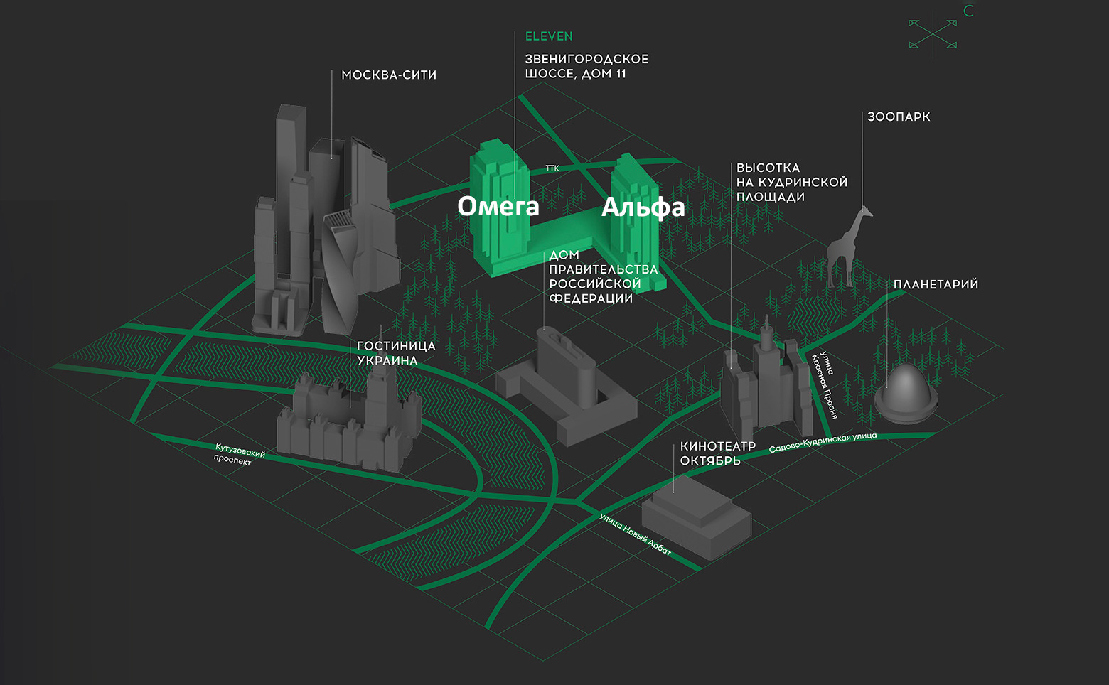 Eleven строится в тихом Краснопресненском районе с развитой инфраструктурой. В пешей доступности от новостройки работают школы и гимназии, крупные торговые центры, медицинские учреждения, почта, зоопарк, рядом находится парк Декабрьского восстания. В 10 минутах пешком расположено метро «Улица 1905 года».