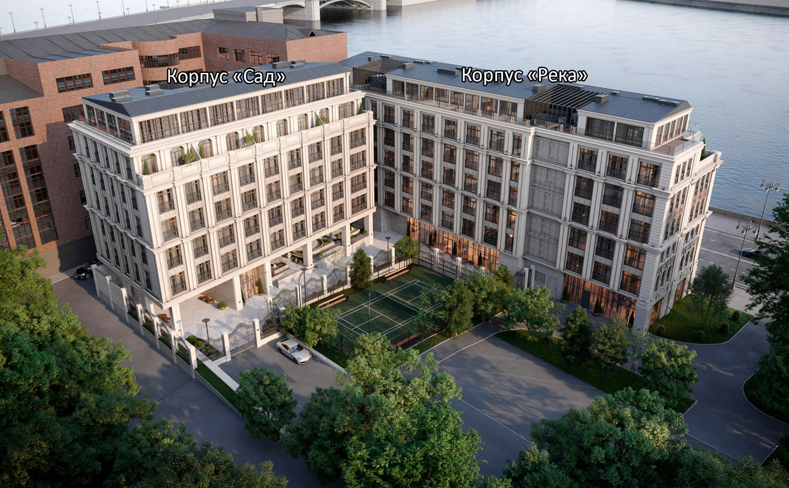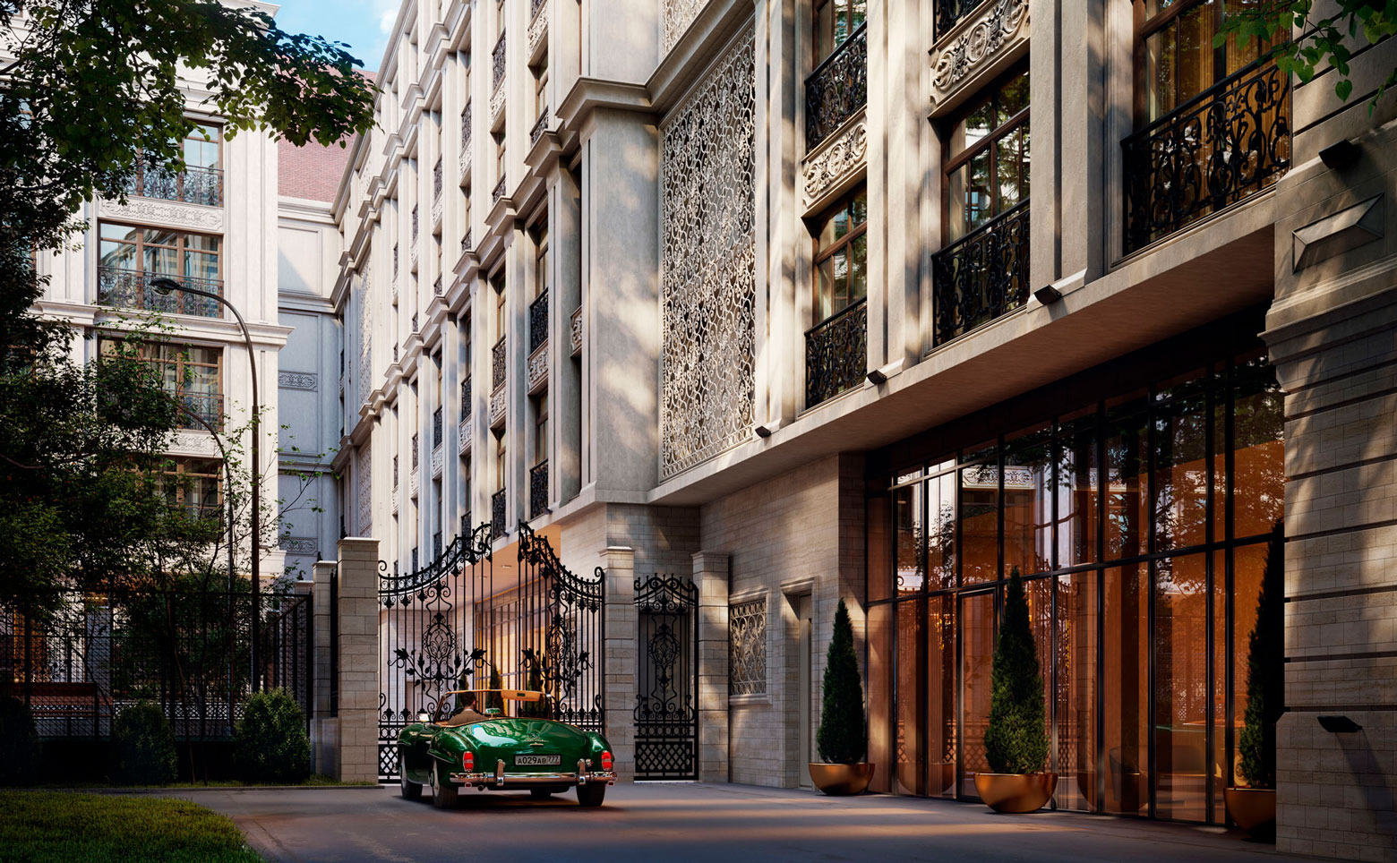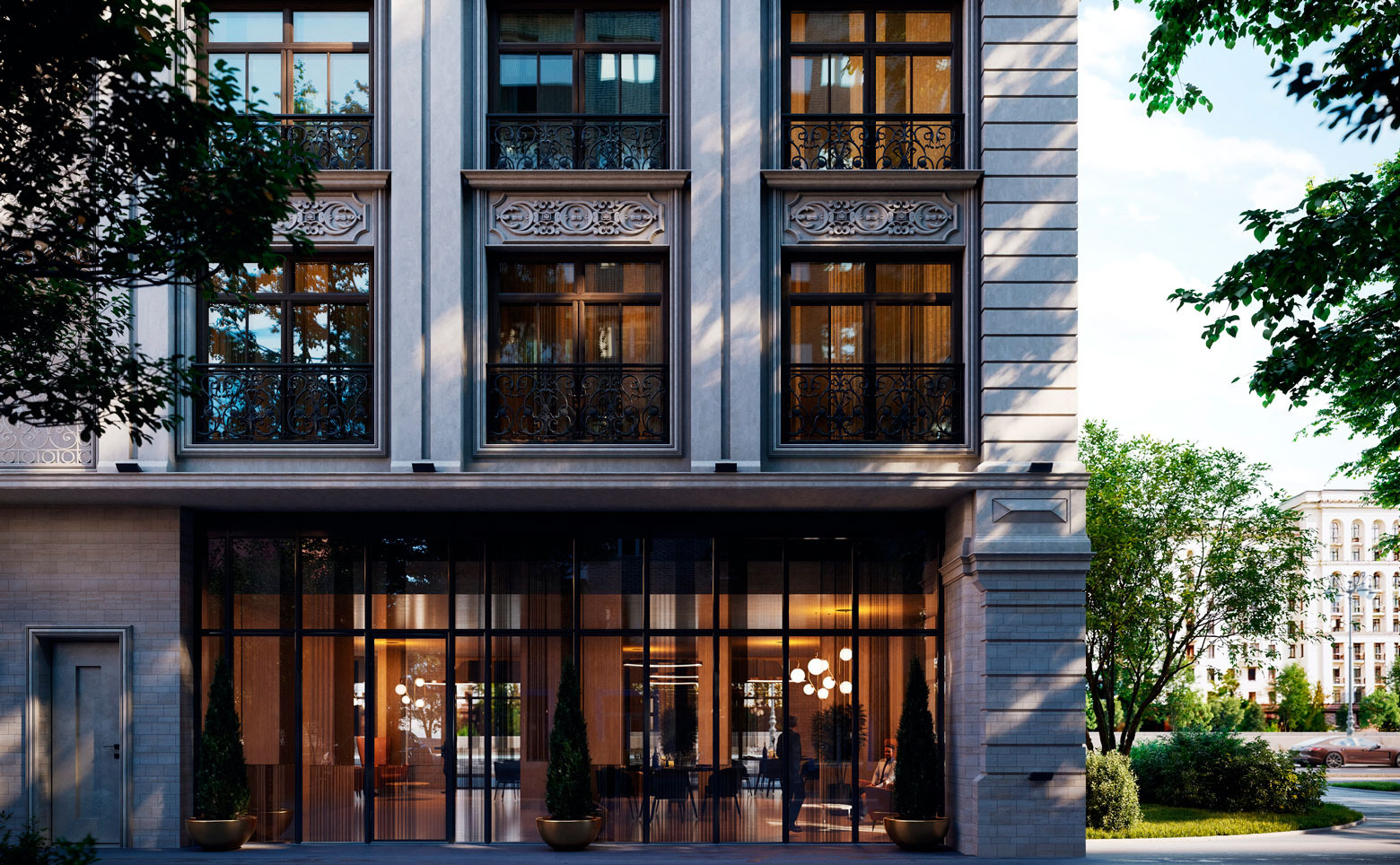 Территория комплекса благоустроена хорошо: предусмотрен закрытый двор-сквер со скульптурами, камерное патио, тенелюбивые растения. В подземной части организован двухуровневый паркинг с зарядными станциями для электрокаров.