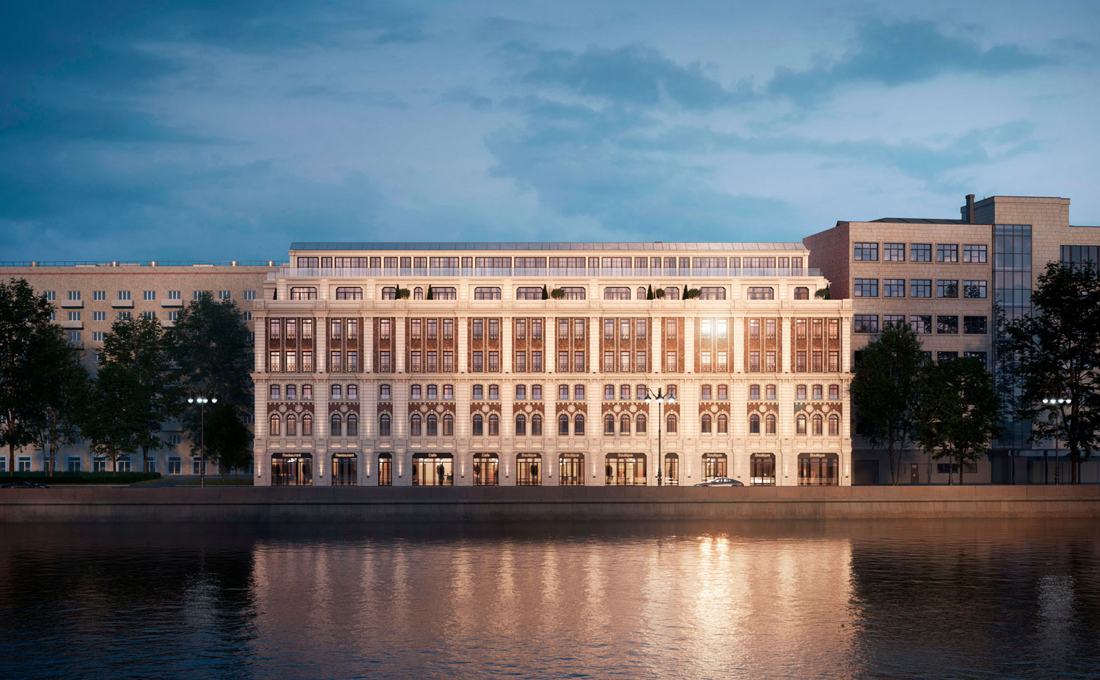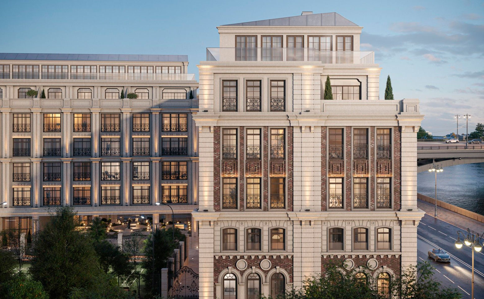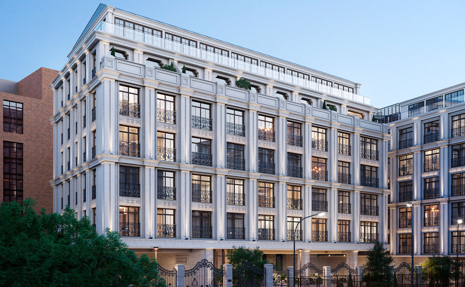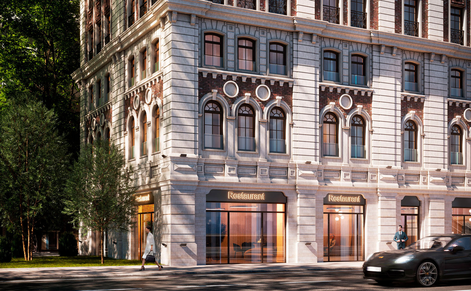 Территория комплекса благоустроена хорошо: предусмотрен закрытый двор-сквер со скульптурами, камерное патио, тенелюбивые растения. В подземной части организован двухуровневый паркинг с зарядными станциями для электрокаров.