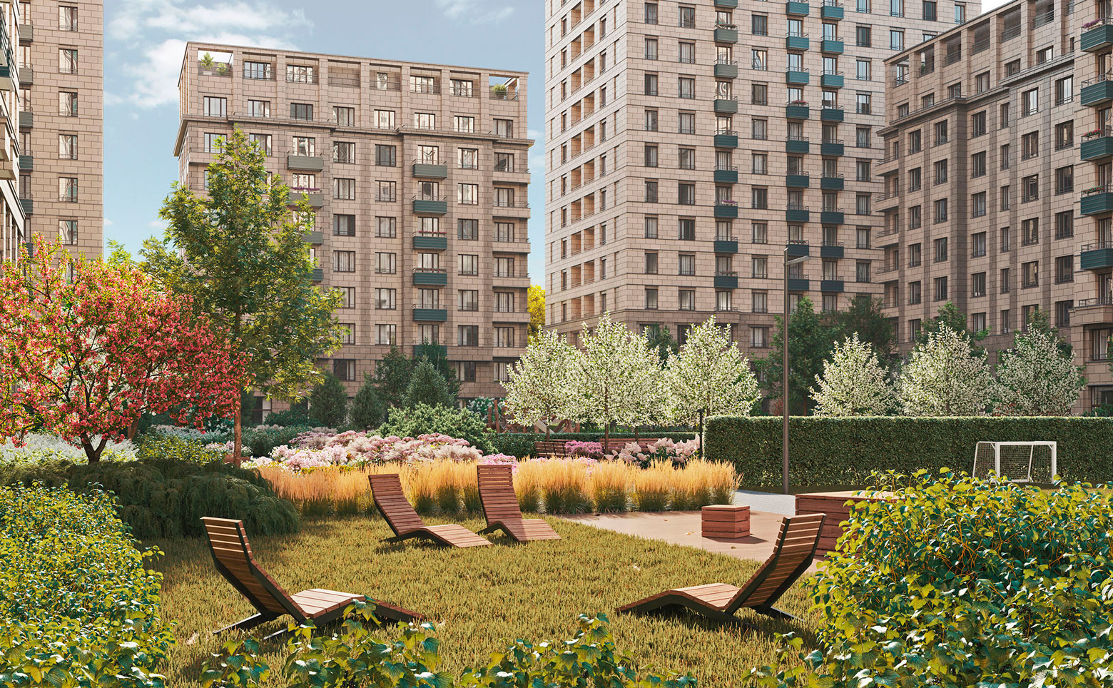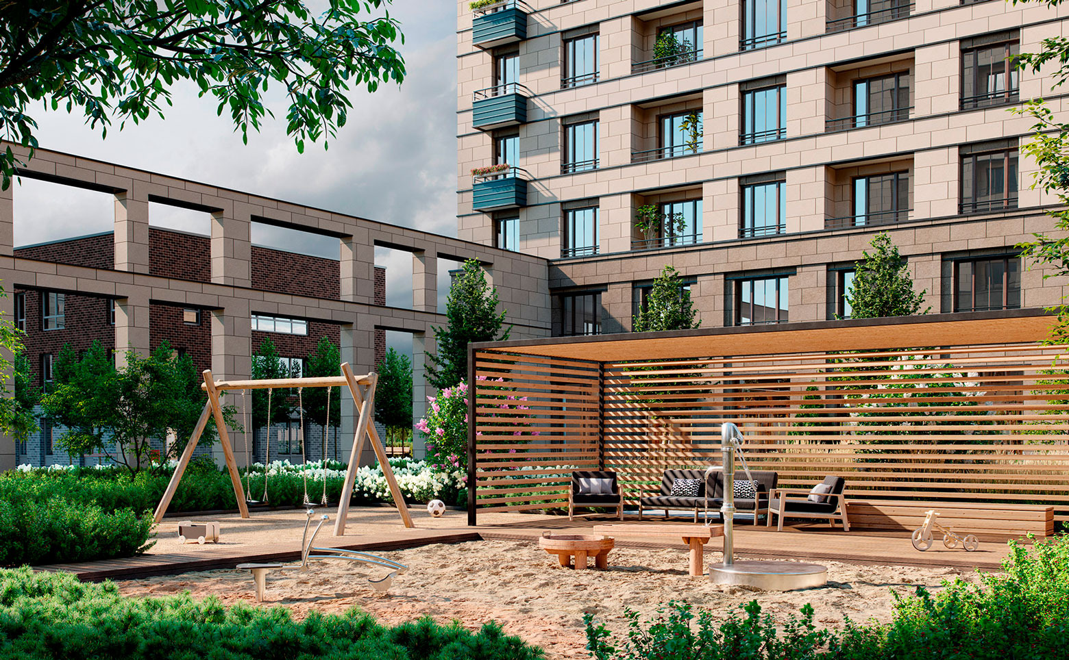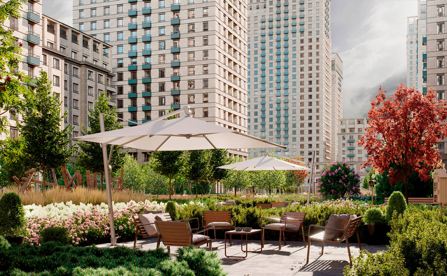 Территория комплекса благоустроена и озеленена: имеется система контроля доступа, открытые террасы на крышах, для автовладельцев предусмотрен подземный паркинг.