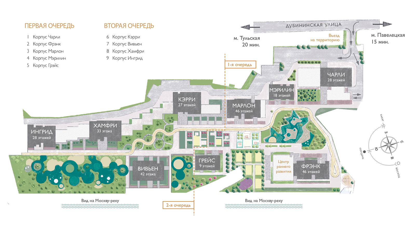Первые этажи отведены под коммерческие помещения. Для автовладельцев предусмотрен подземный паркинг на 372 места с автомойкой. Внутренний двор благоустроен и закрыт от автомобилей и случайных прохожих.