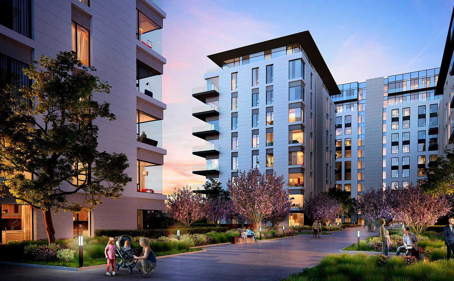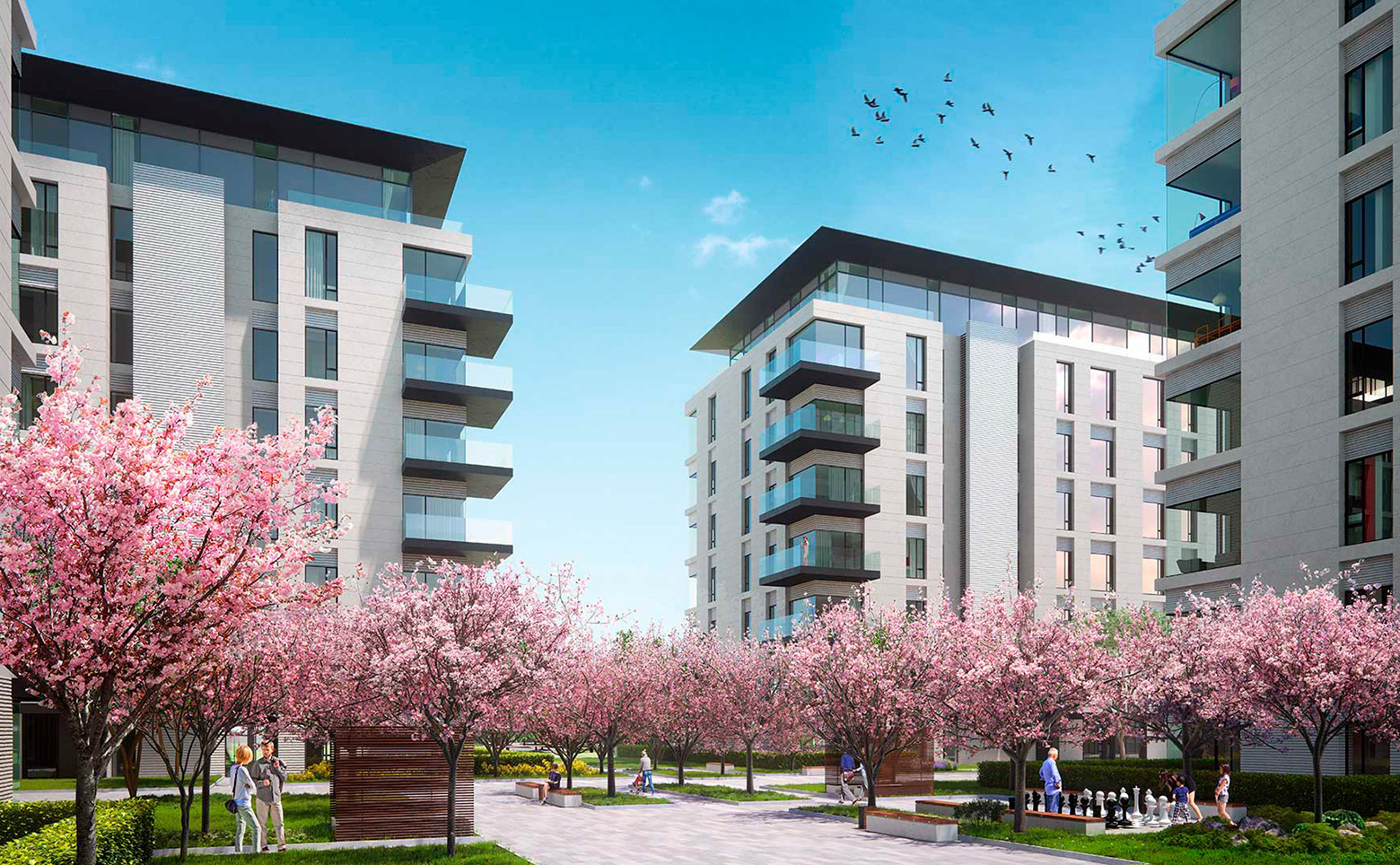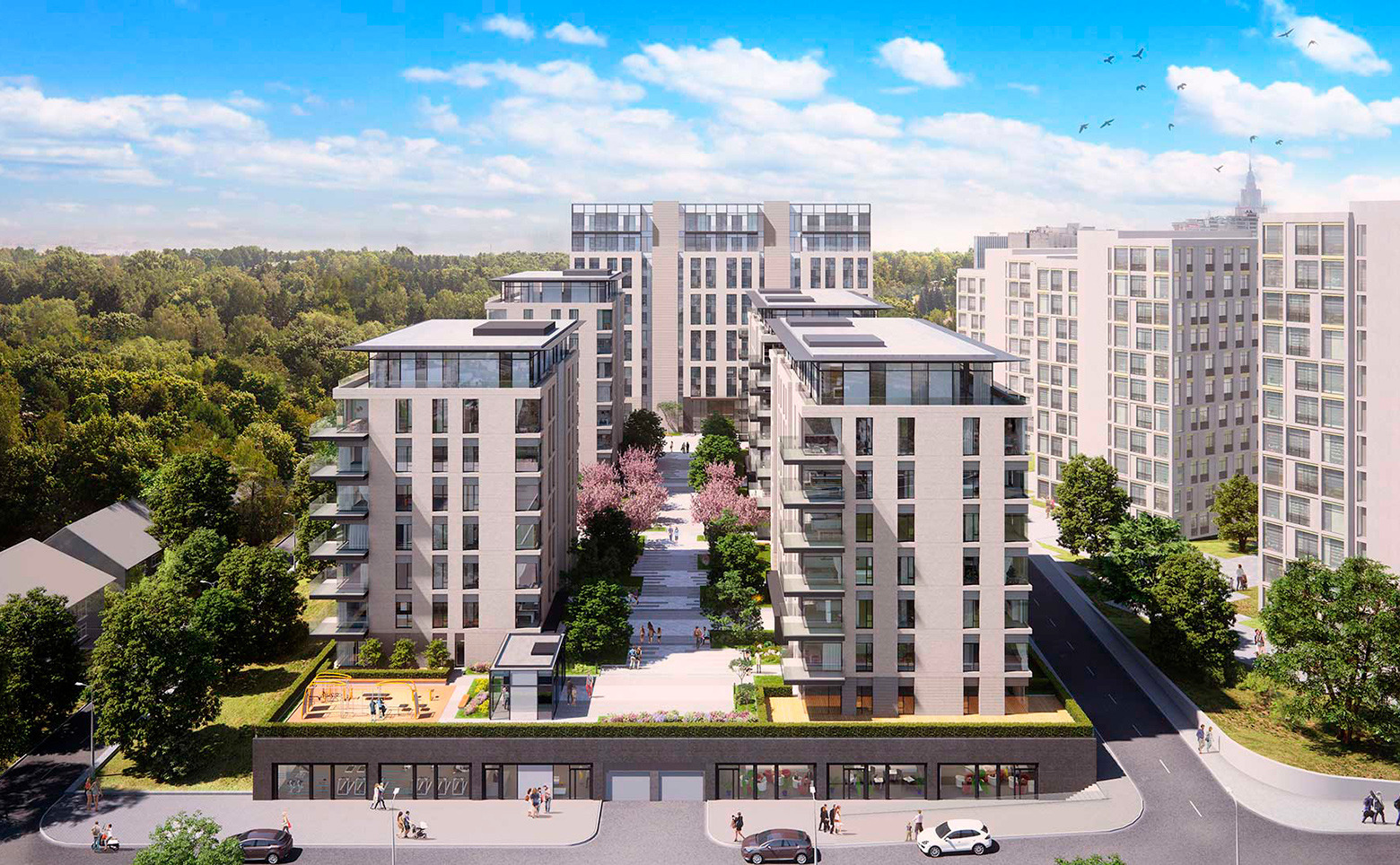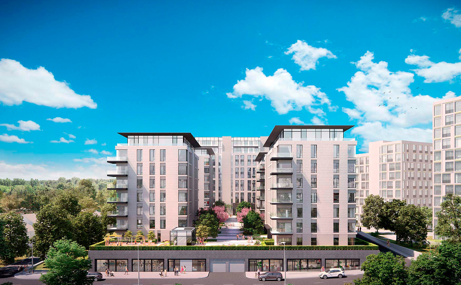 Для жителей предусмотрен круглосуточный консьерж-сервис с услугами помощи по дому, доставка еды и продуктов. В комплексе предусмотрен авторский проект благоустройства, единый для всей территории: он включает в себя несколько цветущих садов, в том числе вишневый, а также авторский дизайн входных групп. Безопасный закрытый внутренний двор свободен от автомобилей. Придомовая территория благоустроена спортивным городком и детскими площадками. В состав комплекса входят детский сад, кафе, бассейн с фитнес– и SPA-зоной. Для автовладельцев предусмотрен подземный паркинг на 460 мест. На территории находится прямой выход в благоустроенный городской парк.