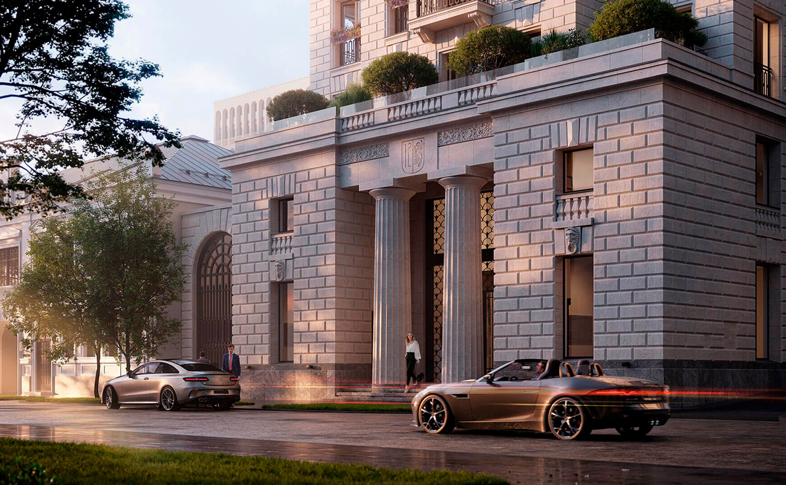 Жилой комплекс «Хамовники 12» — современный клубный дом в неоклассическом стиле. Создавая проект, архитектор Евгений Герасимов вдохновлялся наследием одного из самых влиятельных творцов эпохи Возрождения — Андреа Палладио. Фасад выполнен из натурального юрского камня, оконные рамы и двери — из массива дерева, а входная группа — из серии экологичных материалов: три вида мрамора, шпон, клен, сикамора, гипс, травертин, поталь и латунь. Парадная декорирована коваными воротами, античными скульптурами, греческими колоннами, барельефами с эллинистической пластикой beaux-arts. В лобби расположена собственная библиотека.